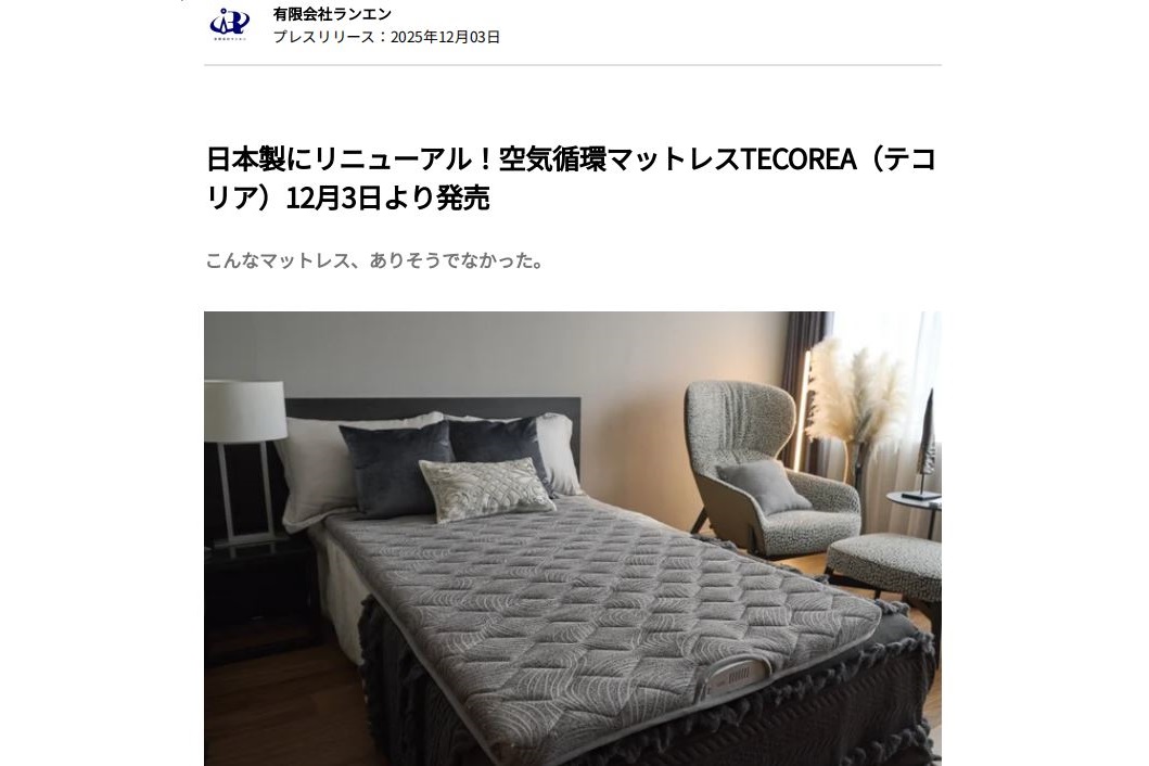 有限会社ランエン(本社:神奈川県川崎市、代表取締役:小里仙哉、以下当社)は、日本製にリニューアルした『空気循環マットレスTECOREA(テコリア)』(以下、テコリア)を2025年12月3日より発売いたします。販売は、Amazon、当社東京ショールームにてスタートし、順次家電量販店にて店頭展示を開始いたします。