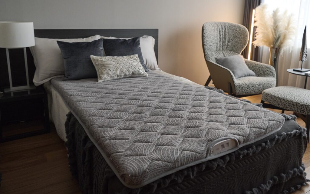 テコリアは、特許技術である「多機能循環機」をマットレスに内蔵することでマットレス内の温度と湿度のコントロールを可能にしたスリープテックです。