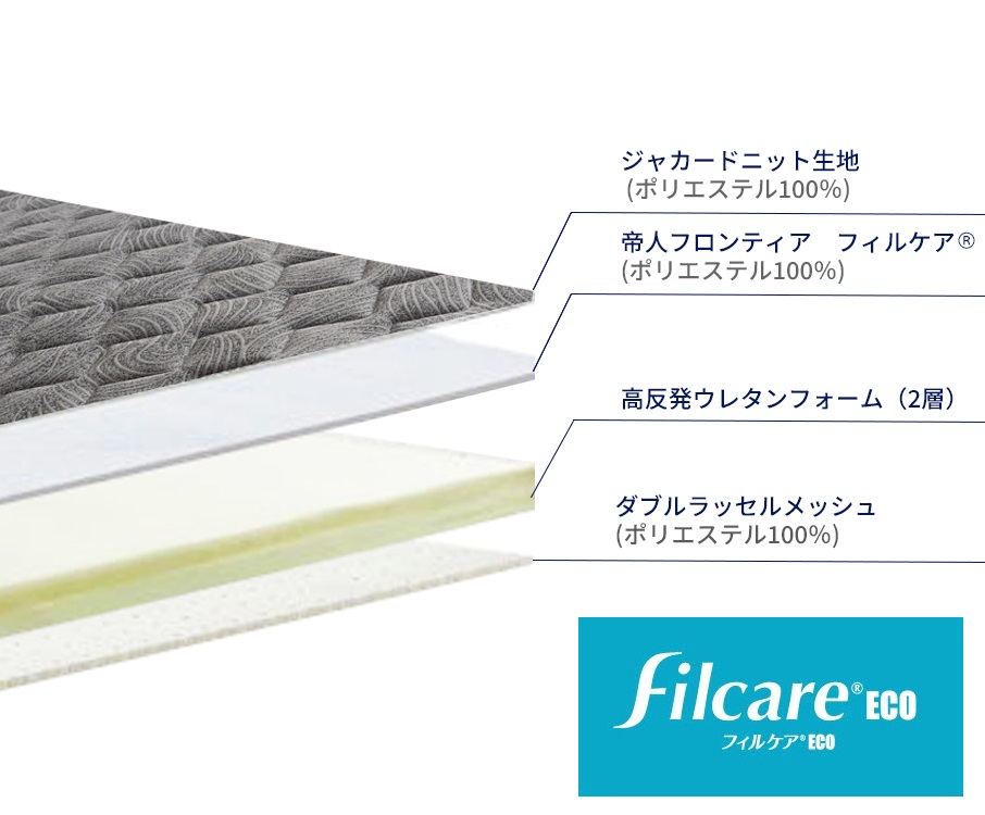 フィルケア®は、SEK基準をクリアする抗菌防臭効果を備えており、細菌の増殖やイヤなニオイを抑えることが可能です。また、らせん状の繊維構造により、軽くてふっくらとした心地良いボリューム感を実現しています。